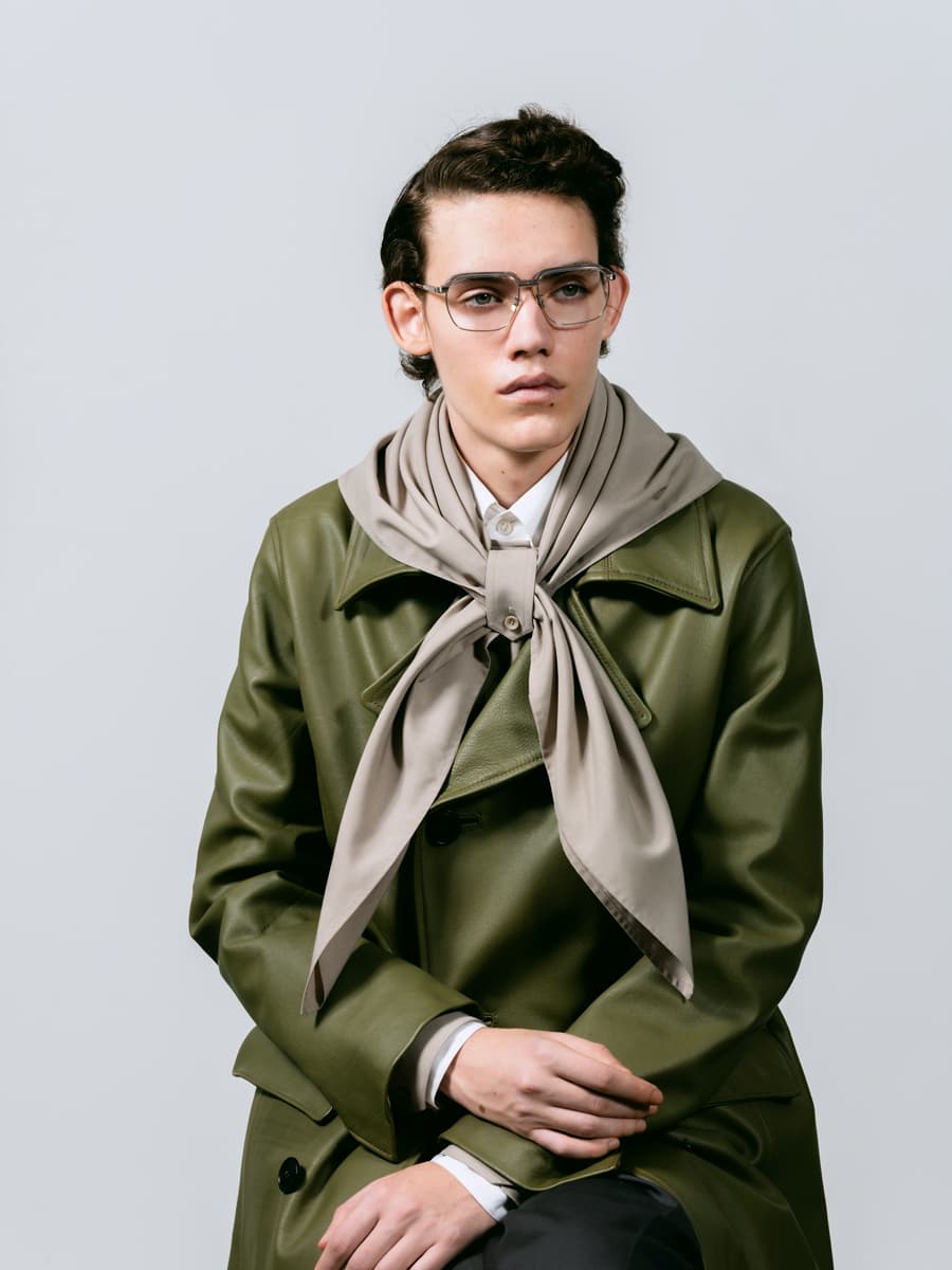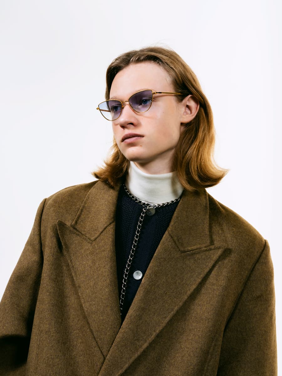 眼鏡を視力矯正の道具ではなく、ファッションとして提案した日本初のブランドEYEVAN。テンプルがヨロイに部分的に重なる特殊構造と、1980年代イタリア製メタルフレームをサンプリングしたシャープなFOXシェイプを融合。あえて彫金装飾を排したミニマルな佇まいは、クラシックを参照しつつも誇張に頼らず、現代のEYEVANが提示する“ニューヴィンテージ”の解釈を体現。肌なじみの良いカラーリングで上品なコートスタイルに色気を添える。