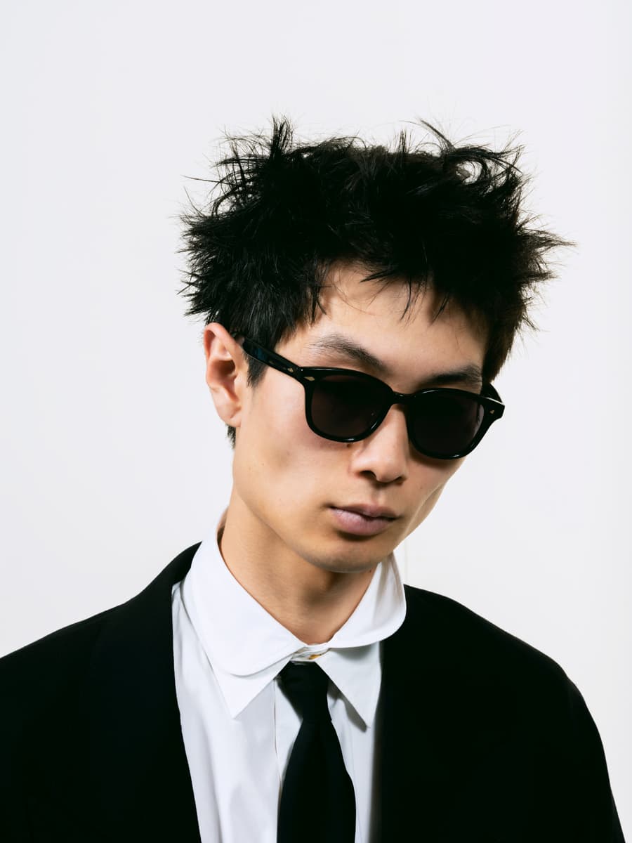十五夜の満月から少しかけた十三番目の月。その不完全な余白に美しさを見出す日本人の感性をNOCHINO OPTICALは映し出してきた。シンプルなスーツにつけ襟のレイヤードと、遊びのあるヘアで、その人ならではのスタイルが完成するように、このメガネもまた、かける人の個性が加わることで真価を発揮する。わずかに大ぶりなフレームはコーデに程よいアクセントを与え、上品な艶や調光レンズにブランドの繊細な美意識が宿る。
