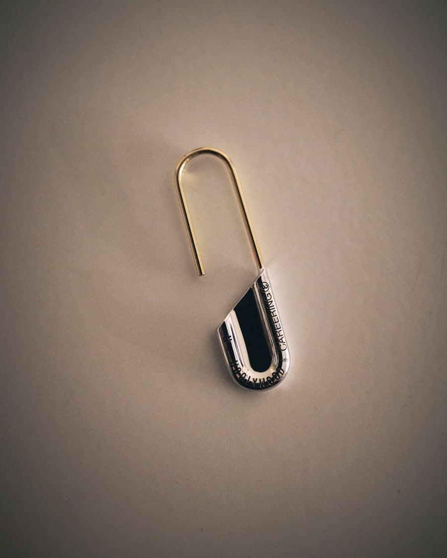尾花:オレも昔工場とかのデカい安全ピンに色んな部屋の鍵をつけてたので、そのイメージはあるかな。やっぱデカすぎると付けないのよ。自社でも何年も前に安全ピンを作ったことあるんだけど、5個ぐらいしか売れなかった(笑)。僕はピアスをいきなり突拍子もなく耳に付けるかもしれないですね。みんなびっくりするかもしれないけど、考えないで、いきなりつけていって慣れさせていかないとファッションって。