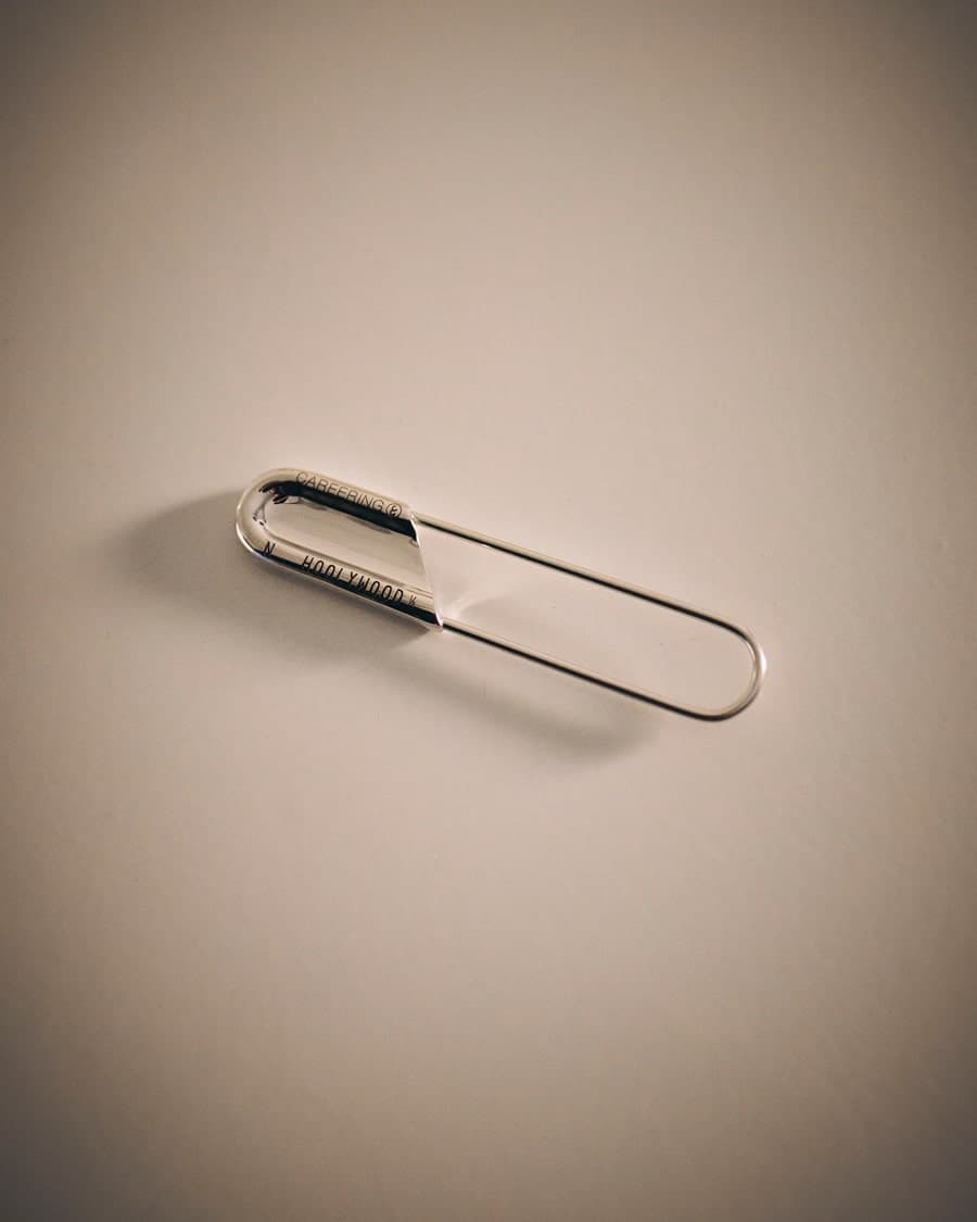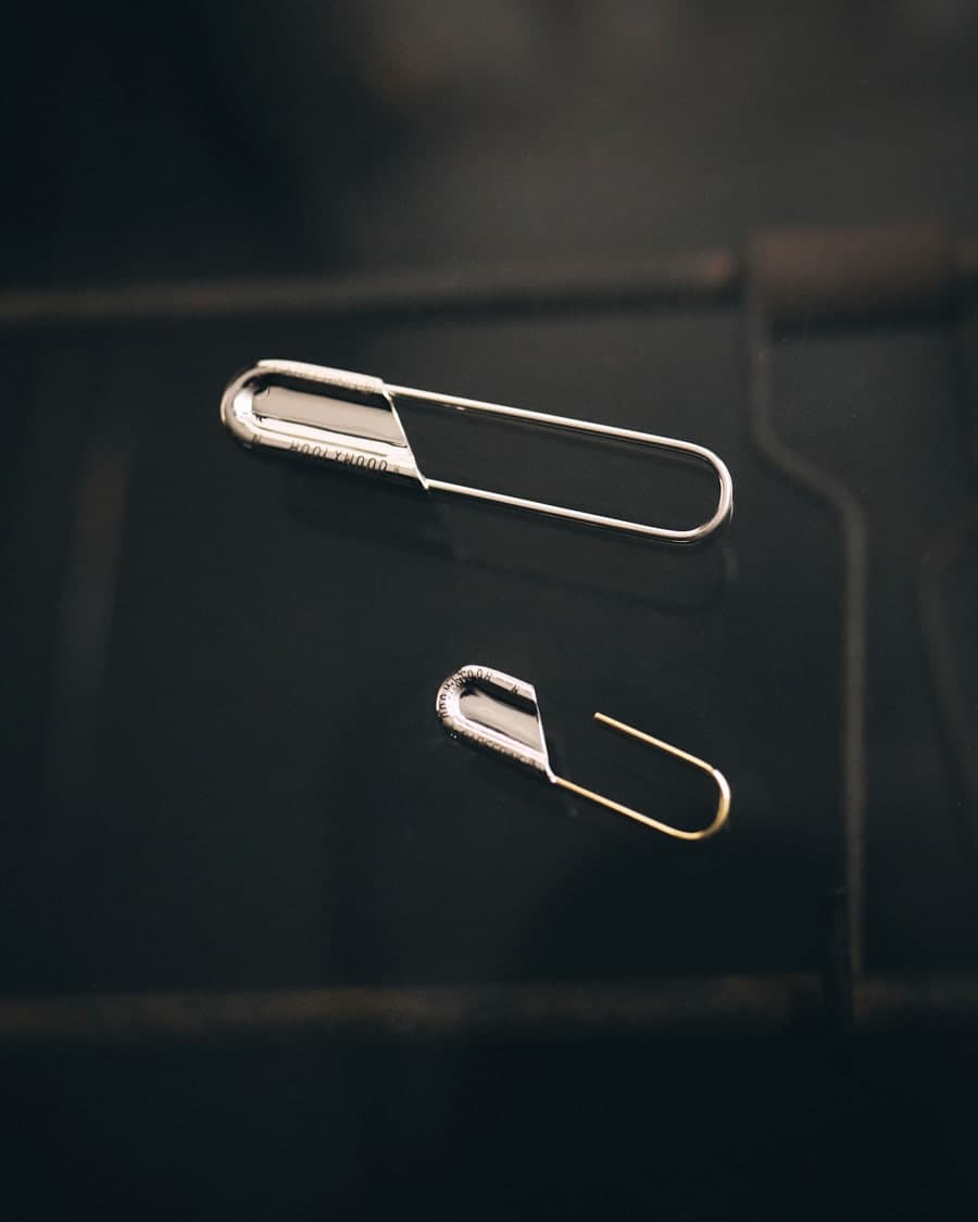 松田:キャリアリングとしてもこれまでシルバーとゴールドしか扱ってなかったんですが、今回初めてステンレスを扱えたので、新しいことが出来て楽しかったな。最初は安全ピンの丸いバネの部分もついたデザインになってたんですが、尾花さんが「それはやめよう、もう少し削ぎ落とそうよ」ということになって。構造上うまくできるか不安だったんですが、うまくいきました。清潔感と繊細さもある見たことのない安全ピンができましたね。
