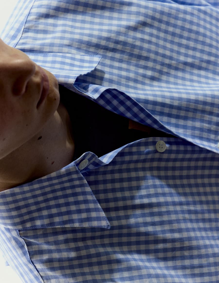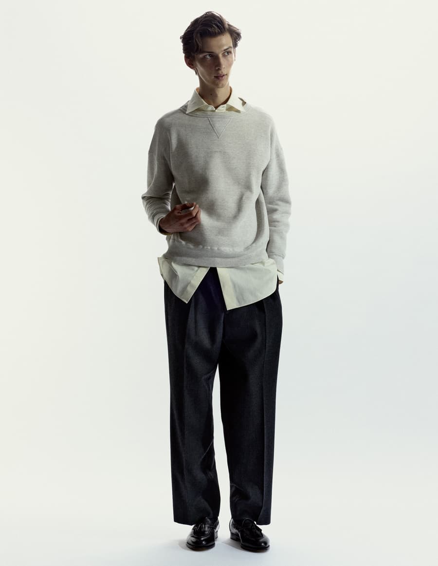 襟付きのシャツは、TPOを意識した装いにおいてごく当たり前の存在。しかし、しっかりとした襟のドレスシャツをカジュアルに取り入れると、今の時代にはむしろ新鮮に映る。グレーのスウェットの下から覗くワイドカラー。その一枚で、スタイルはぐっとジェントルに変わるのだ。