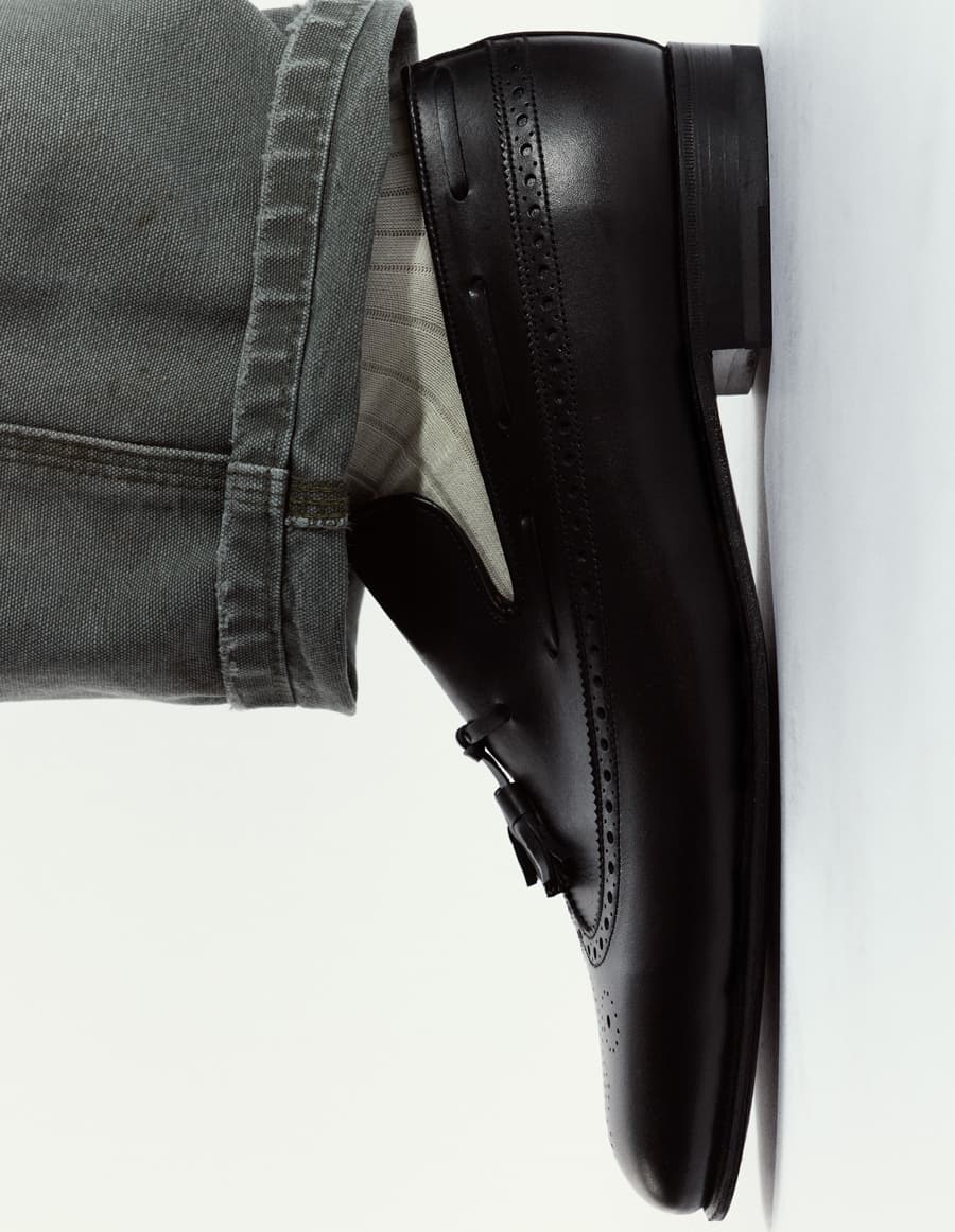 デニムにスニーカー。それは誰もが知る定番のスタイルだ。だが「ジェントル」を謳うなら、足元にこそ最高の革靴を選びたい。ジョッパーブーツは、世田谷代田のリペア職人集団〈BRASS TOKYO〉が手掛けるブランド“クリンチ”によるもの。リペアで培った技術を注ぎ込み、上質な素材を用いたハンドクラフトの逸品だ。ジェイエムウエストンのブローグタッセルローファーは、タッセルや穴飾りを組み合わせた新作。モダンでありながらドレッシーな空気をまとい、デニムを一段引き上げる存在となる。