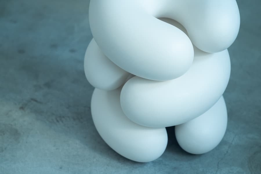 南の予想をいい意味で裏切ったアカシの作品。制作のテーマは、人、もの、自然らの結びつきだという。「身近にある些細なものごとをすくい上げて、深く考えていくことでたどり着く気づきを形にする方法を探しています。生活や時間、積み重ねや反復といった“日常的”なことの輪郭を探している感覚です。人と人の肌が触れ合ったり、もたれかかり合ったり、腕に身につけていたバングルの重なりにフォーカスしたりと、生活に潜む微かな動きや形に惹かれます。ものごとの新しい見方を探るような感覚でもあります。なのでこの作品は『実際に目で見て、触りたい』と思ってもらうことを意識して作り上げていきます。彫塑粘土でベースを作り、石粉粘土で固めていく。塗り重ねては削るという作業を繰り返して形成していきます。あるところまで形ができあがると、あとは削って研磨し続けていきます。しっとりと吸い付くような肌質を目指しています。その質感を最大限に生かすために、焼かずに生のままにしています。着色せずに粘土の白さのままにしているのは、見る人に想像の余白を残したいから。なので置く場所や1日の時間の変化、季節の変化などによって、これらの彫刻の表情はガラッと変わることを楽しんでくれる人も多いです。そのような気づきを持ってもらえると、この作品で伝えたかったメッセージが届いているのだなと嬉しくなります」。