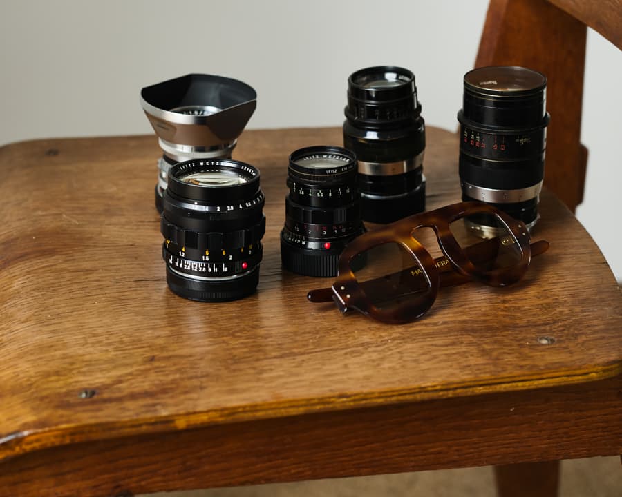「メガネもカメラもレンズも何個も同じものを買って、使い比べることが好き。レンズで言うと、ライカのヘクトール73mmを4本とか、50mmはもう何本買ったかわからない。そうやってエビデンスを増やしていくと、個体差が見えてくるんです。『これは誰かが磨いているな』、『これが本当の30年代の写りだな』とか。純度の高いオリジナルだけを残して、それ以外は手放す。その作業を続けていくと、『オリジナル族には、次の世代にそれを継承する責任があるんだな』と自然と思うようになる。運命というか、ミッションのような。メガネも同じです。ヴィンテージか復刻のどちらかを選ぶのは人それぞれ自由です。でも、ダブルエックスのデニムと一緒で、オリジナルとリプロダクト品は明らかに波動が違う。元々持っている固有周波数のようなものが違う。そこに惹かれちゃう人間は、もうオリジナル族として生きるしかないんです。諦めましょう」。
