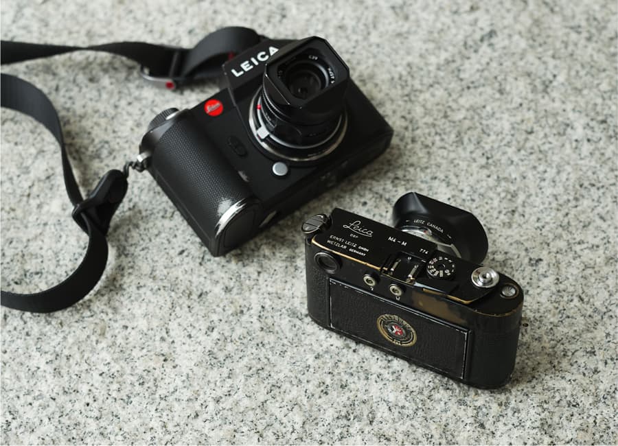 仕事でメインに使う用のSL2と、家族のつながりを感じながら使うライカM4。M4は、ところどころ表面の塗装が剥げてきており、剥き出しになった真鍮が美しい。