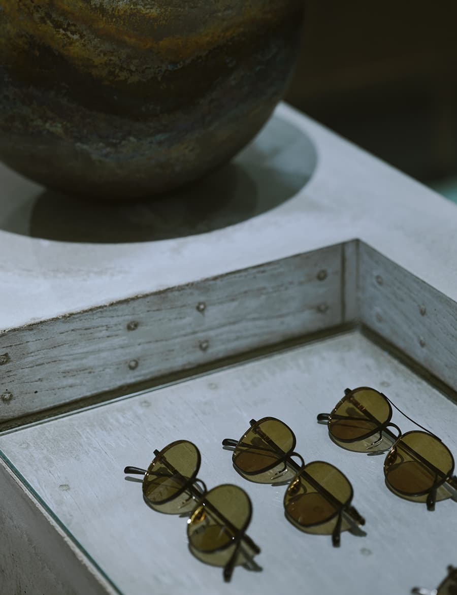 「僕がまだ幼い頃はアイウエアは今ほどファッション的でもポジティブなイメージがあるものでもなかったんです。そんなある時テレビを見ていると俳優の陣内孝則さんがアランミクリの横長のスカッとしたデザインのアイウエアをかけているのを見て『うわ、かっこいい』と思ったんです。当時サングラスといえば、レイバンくらいしか知らなかった僕には衝撃的でした。ほかにもジェームス・ディーンがかけるクリップオンのセルフレームやデニス・ホッパーのレイバンなど、海外の俳優がかけているアイウエアなどに憧れていきました。そこからはまっていったのが、ヒップホップです。トゥーパックやテディー・ライリーがかけていたゴルチェのサングラスは衝撃的で今でも強く記憶に残っています。この時のインスピレーションやサンプリングに感じた彼らのオリジナリティは今のアイウエア作りにも活かされています」。