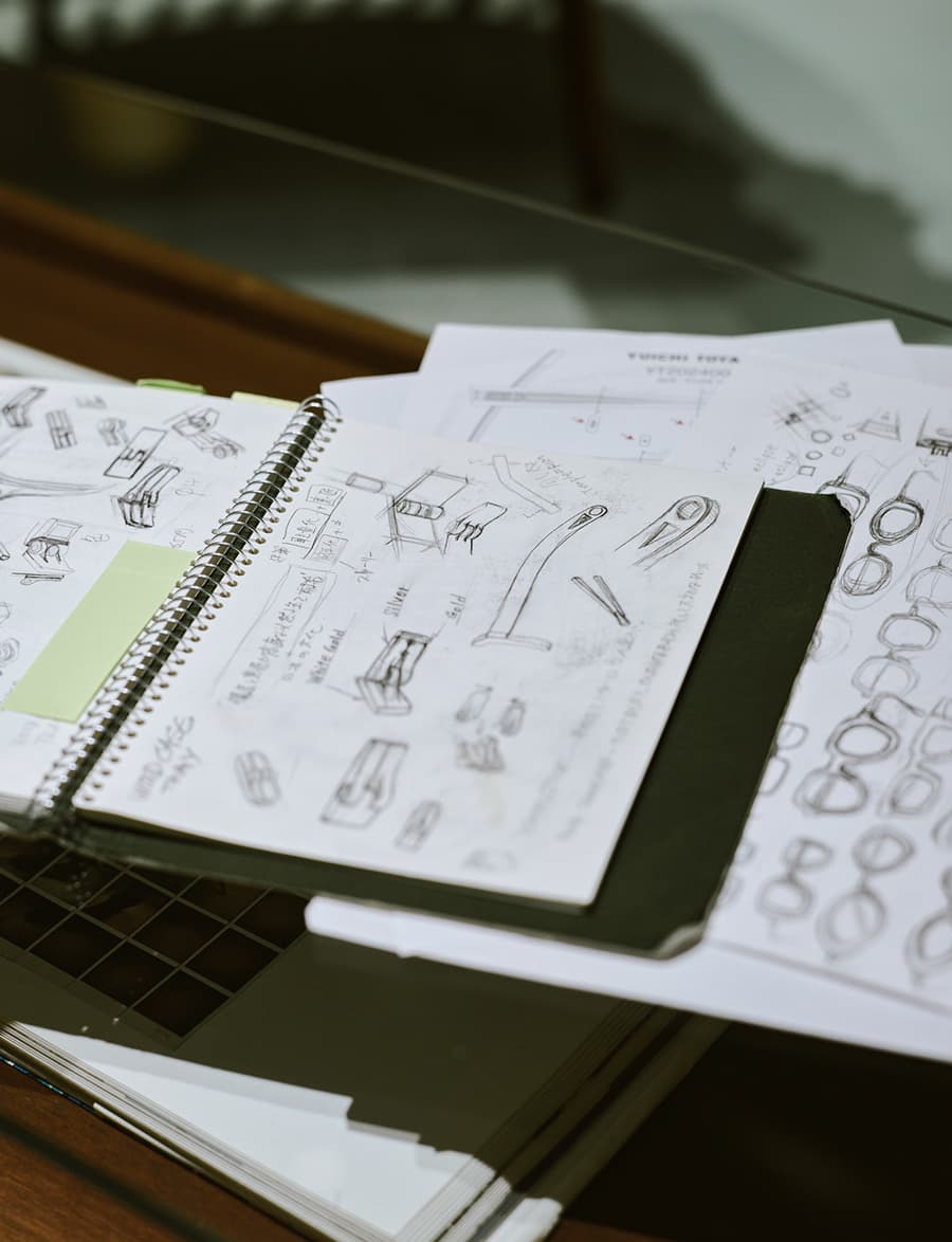「昨今国外でもアイウエア作りは容易に安価で行えるようになりました。それでも鯖江でアイウエア作りを行う理由は職人との緻密な対話が可能だからです。彼らには長年にわたって培ってきたノウハウがあるので、しっかりと話し合っていけば、こちらのやりたいことを実現できる確かな技術力があります。ただ職人さんの集まりなので、基本的にはできないと言われることが多いんです。それでも彼らの技術力を最大限に活かすには会話を繰り返しながら、少しずつ実現してもらえるようにコミュニケーションを繰り返していくことが大切だと思います。前職から数え30年以上に渡り試作品を作ってもらっている試作職人の方もいて、彼らの技術なしでは体現し得ないことが数多くあります。こうやって僕が色々な人に協力をしてもらいながらアイウエアデザインを続けているのは、ユウイチ トヤマ.の哲学を継承していくためだと思っています。派手なものは伝わりやすいけど、ユウイチ トヤマ.のようなこれみよがしではないデザインが人に伝わっていくにはかなりの時間がかかります。ただ時間がかかるからこそ、それを次世代のデザイナー、お店に来てくれているお客様にも自分の考え方や視点を伝えていきたいと思っています。特にこれからの世代交代を見据えて、自分の考え方や、哲学を継承していきたいんです。世代が変わればデザインが代わる。下の世代には変化していってほしいので、そうやって変わっていく時代の中でも、考え方や哲学の根幹にユウイチ トヤマ.の精神性を残していきたいと思っています」。