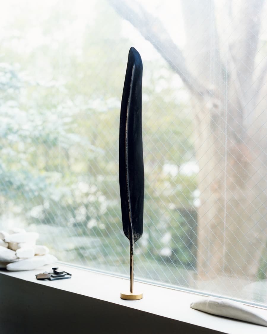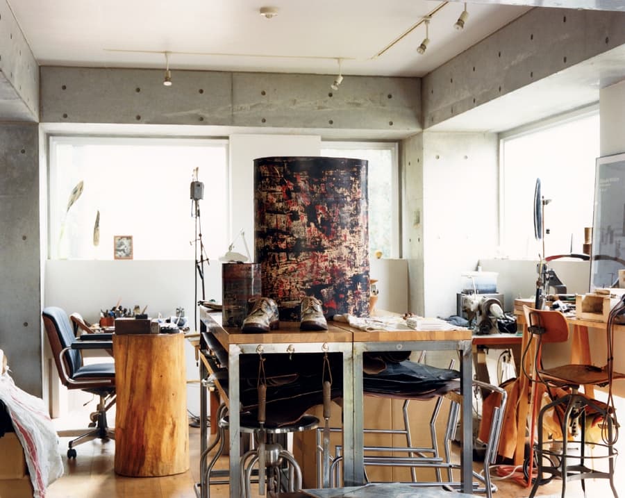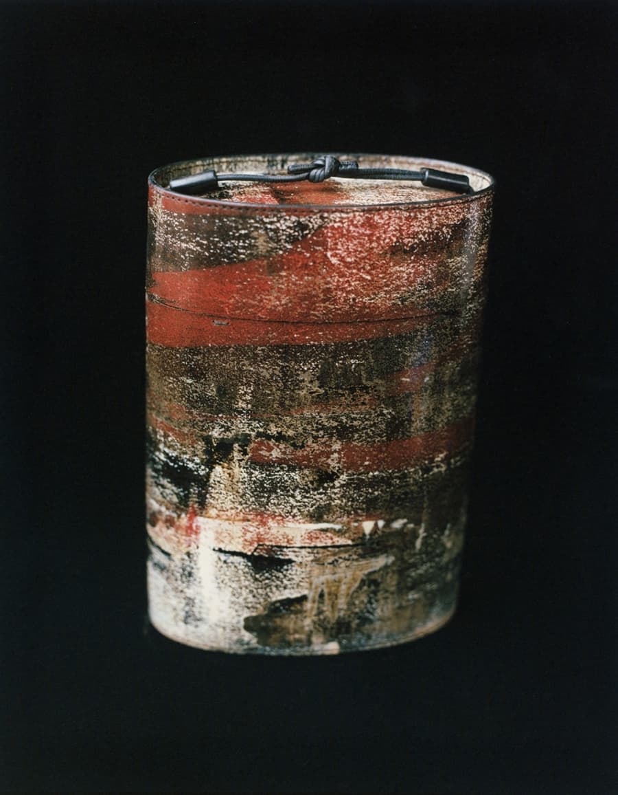 彼の作品はバッグや履物、オブジェといった具体的な形を持ちながら、どこか彫刻のような静けさを帯びている。バッグは持ち歩くための道具でありながら、家に帰ると箱のように自立し、空間の中に置かれる存在へと変わる。「この鞄は茶筒や印籠のような形状になっていて、家に帰ると、箱に戻るっていうのがコンセプトなんです。家に帰って、紐をしまい、棚に置くとオブジェになる」。使われる時間と、眺められる時間。その両方を受け止める器として作品は存在している。
