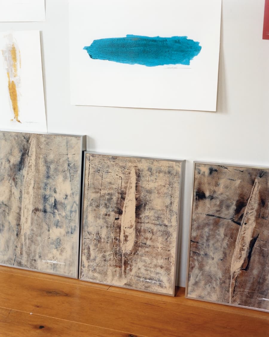静かな工房で彼の作品を前にすると、まず、時間の流れ方が変わった。光を鈍く返す漆の表面には、塗られたというより、どこかから浮かび上がってきたかのような色の層が宿っている。近づいて目を凝らすと、そこには均一な塗膜ではなく、革の繊維がつくる微かな凹凸や揺らぎがそのまま景色となって現れていることに気づく。「1つの作品を作るのに大体漆は7層塗っています。塗って乾かして研いで、塗って乾かして研いで、っていう風に。それによって一切厚みを持たせてないんです。7層塗ってもおそらく1ミリもない層になっているんです。要は塗ったものを取っているので」。 重ねるほどに厚くなるはずの塗膜を、あえて削り落とす。削ることで、初めてその奥に潜んでいた色が立ち現れる。彼はその現象を説明する時、慎重に言葉を選ぶ。「よく勘違いをされるんですが、色を塗って最後に研いで柄を出しているわけじゃないんです。それだと出ない。僕が狙ってここだけ塗ったわけではなくて、革本来の表面にある凹凸がそのまま出てくる。作為的ではないんです」。 研ぎの作業は、表面を整える行為であると同時に、素材の記憶を掘り起こす行為でもある。砥石で平らにならしていくうち、革の繊維が絡み合っていた痕跡や、わずかな歪みが姿を現す。「砥石でフラットに研ぐ。そうすると、この柄が現れる」。それは描かれた模様ではなく、時間そのものが滲み出た痕跡のようだ。
