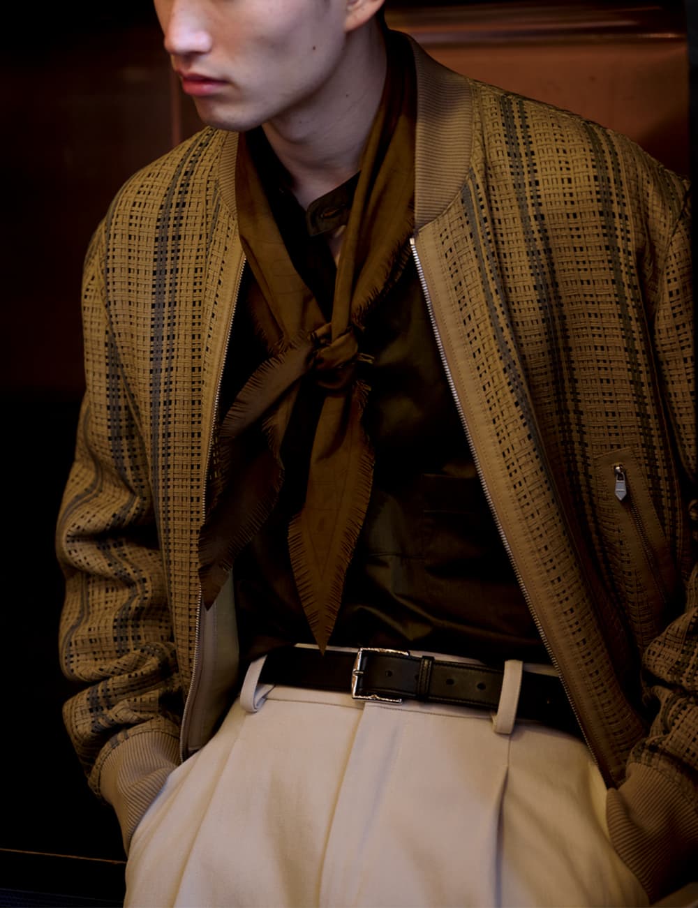 Jacket ¥700700 Shirt ¥195800 Pants ¥190300 Leather Scarf [Reference Item] Necklace ¥272800 [Reference Color] Belt ¥166100 Ring ¥68200 Shoes ¥204600 by HERMÈS (HERMÈS JAPON)