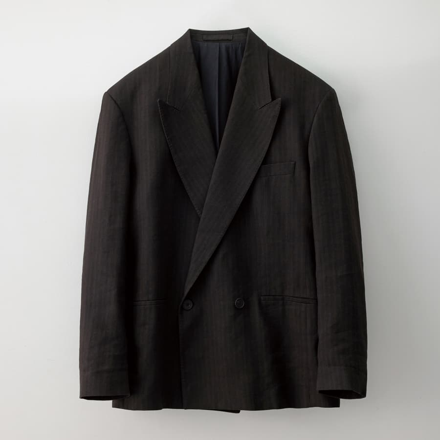 ビスコースとリネンを掛け合わせた先染めヘリンボーンが、素朴さとしなやかさを併せ持つ。身体の動きに沿って揺れるドレープが描く柔らかな曲線は、スタイリングに軽やかさを演出してくれる。装飾を削ぎ落としたダブルブレストのオーバーシルエットは構築的でありながら、さらりと羽織るだけで、肩の力が抜けたモダンな空気をまとう。