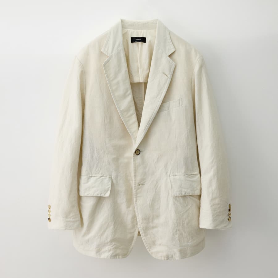 白いジャケットは誠実さやフォーマルな印象を与えやすいが、リネンとウールを掛け合わせた素材がほどよい抜けを生み、上品さの中にやわらかな空気を宿す。ひとつひとつ表情の異なるボタンがクラフト感を添え、セットアップで端正にも、ゆったりとしたハーフパンツなどとも合わせて軽やかにも楽しめる。