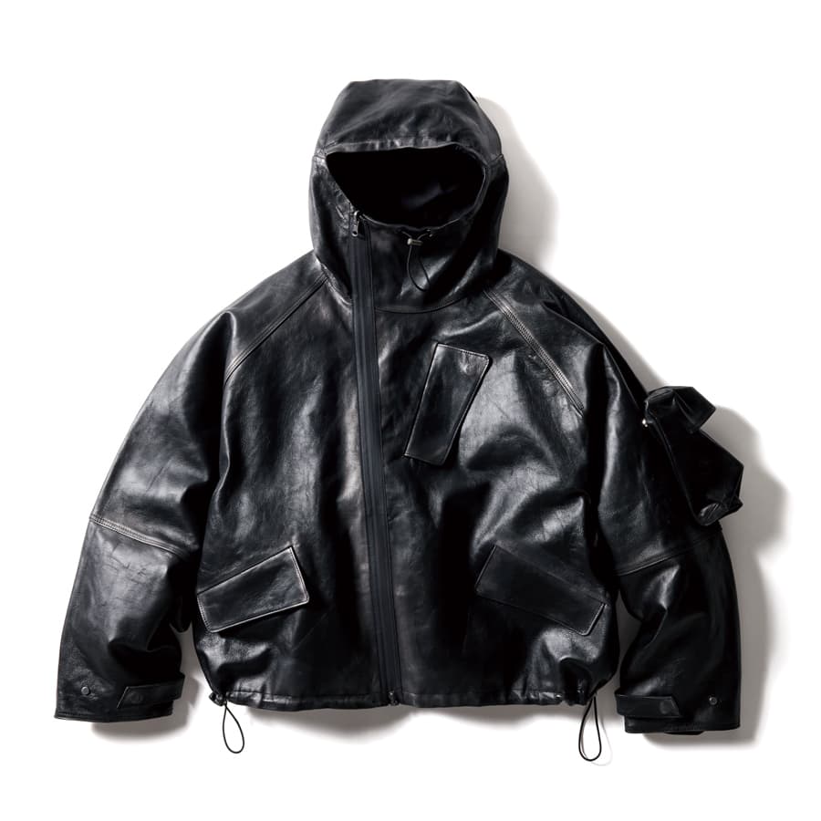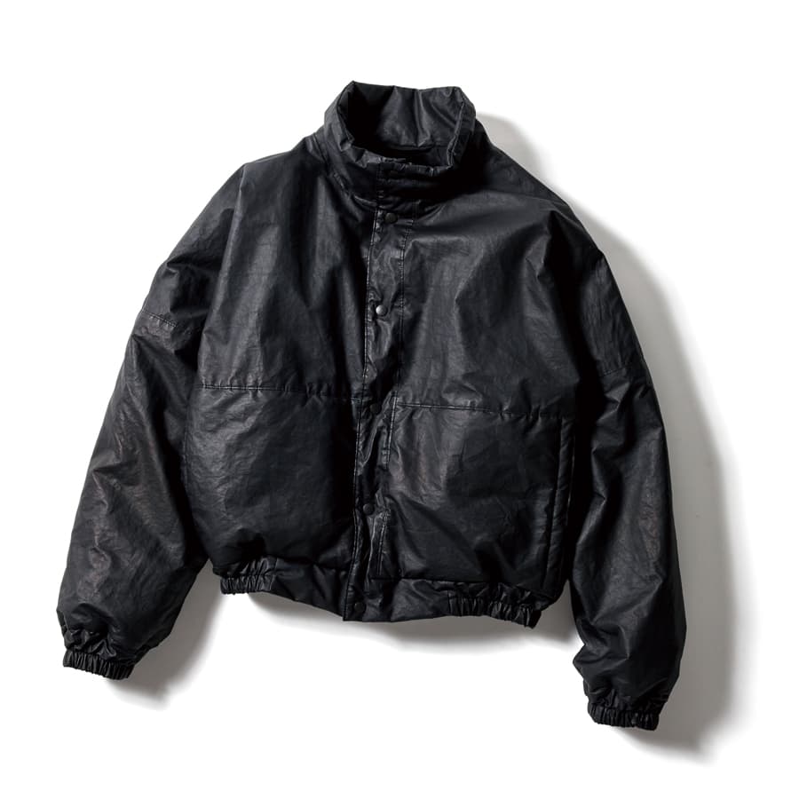 極限まで薄くすいたシープスキンを紙のように仕上げたペーパーレザーをアウターシェルに採用した異色作。張りとしなやかな艶を併せ持つ独特な素材は、着るほどにレザー本来の柔らかな質感が現れ、裾を強く絞ったショート丈と特徴的な膨らみのあるフォルムがユニークなシルエットを描き出している。裏地にシルクを配したパデッド構造で、レザー製品とは思えない軽快な着心地だ。