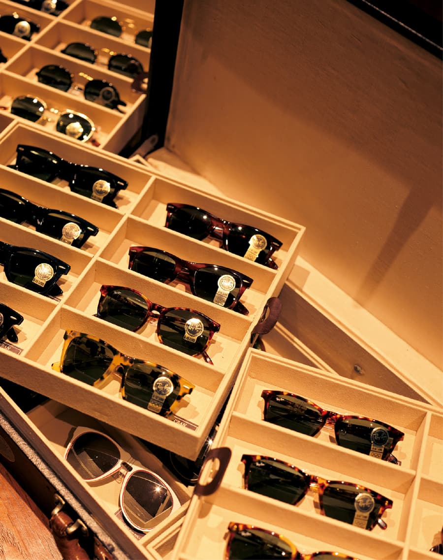 そう語る言葉通り、その哲学は店内の空間づくりにも表れている。様々な什器が並ぶ店内。フランスの銀行で使われていたテーブルや元々は歯医者で使用するために作られたデンタルライトなど、世界中から集めたヴィンテージ家具が空間に奥行きを与えており、まさに世界中を旅する男性の趣味が反映された一室のようだった。