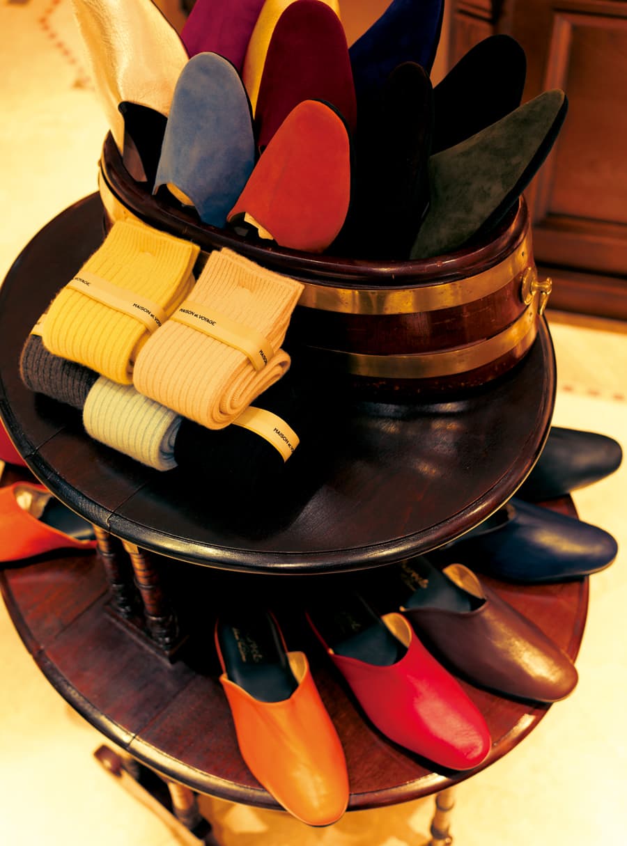ジャケットやシャツとともに並んでいるのが、世界中からセレクトされたシューズやアクセサリー類だ。シャルベのルームサンダルにジェイエムウエストンの革靴、ロレックスをはじめとしたヴィンテージウォッチなど最上級の品々が揃っており、メゾン エ ヴォヤージュの理想とする男性像は店頭に並ぶラインナップからも伝わってくる。