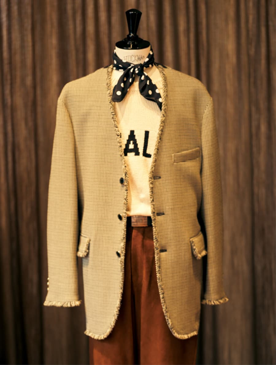 「このお店に並ぶアイテムのセレクトは、1人の男性を想像しているんです。その男性は休日もあるし、仕事の日もある。休日にリゾート地へ行く時や、もっとカジュアルにアクティブなことをする時、どんなものを身につけて、どんな1日を過ごしているのか。そんな一瞬にふさわしいアイテムとは何なのか。そんなことを考えて世界中から買い付けをして、お客様にも提案しています。基本的にはクラシック。ですが、モダンな色合わせや小物の色味でどこか遊び心のある、そんなスタイルを追いかけ続けています。その中でもジャケットは、メゾン エ ヴォヤージュを代表するアイテムです。着る機会が減っているからこそ、あえてカチッと着る日もあれば、遊び心を持って自由に着こなす日もある。ジャケットは、私たちの遊びを成立させるクラシックの土台を体現してくれるアイテムなんです」。