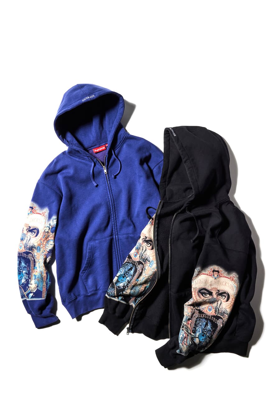 有名でポップすぎて……そんなことを言いがちな天邪鬼たちにも、そんな風には扱えないほどの本物が世には存在する。認めざるを得ないというもの。このシュプリームとマイケル・ジャクソンのコラボレーションはそんなことを考えさせられる。アメリカのポップカルチャーの象徴とも言える両者。80年代以降、世界の音楽の中心であったマイケル、90年代から現在に至るまでストリートスタイル、スケートボードシーンの中核であるシュプリーム。今回のコラボレーションはマイケルの中でもまさにシュプリームの創業期に発表されたアルバム『Dangerous』を題材にしたもの。このアルバムは全世界でCD3000万枚以上を売り上げ、収録曲「Black or White」のMVは人種や国籍の垣根を超えるメッセージ性の強い作品で、あまりにセンセーショナルだった。2017年以来、今回で2度目となるKing of PopとKing of Streetの共演。アメリカ、ストリートカルチャー、世界のポップカルチャーの象徴として歴史に残る軌跡でもある。